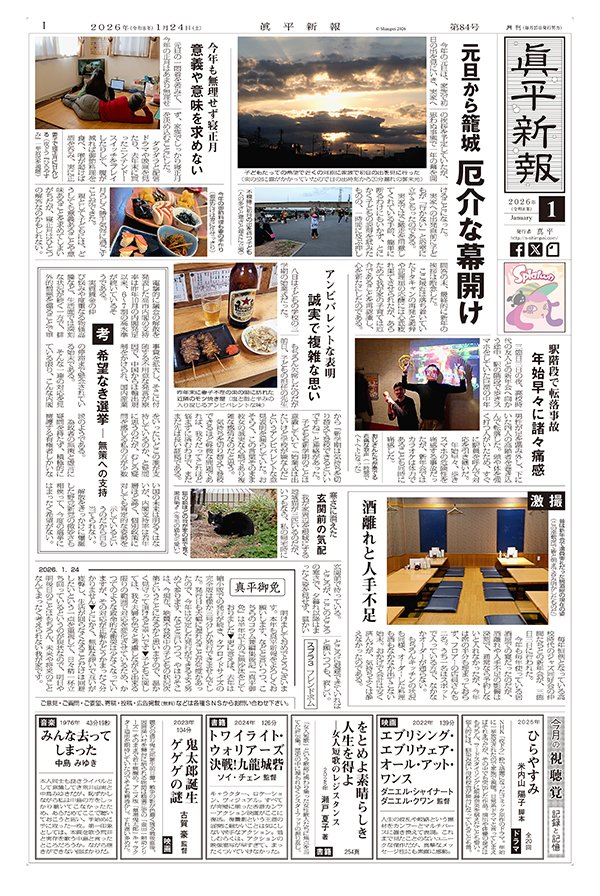 元旦から籠城 厄介な幕開け / 今年も無理せず寝正月 意義や意味を求めない / アンビバレントな表明 誠実で複雑な思い / 考 希望なき選挙 ― 無策への支持 / 駅階段で転落事故 年始早々に諸々痛感 / 激撮 酒離れと人手不足 / 寒さに消えた 玄関前の気配 真平御免 / 今月の視聴覚 記録と記憶