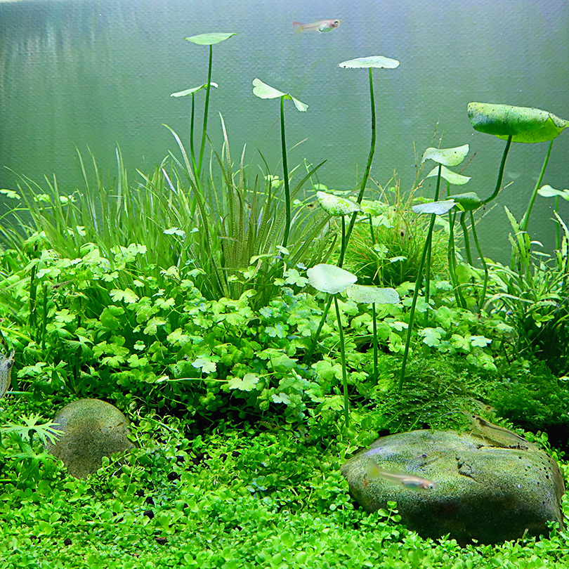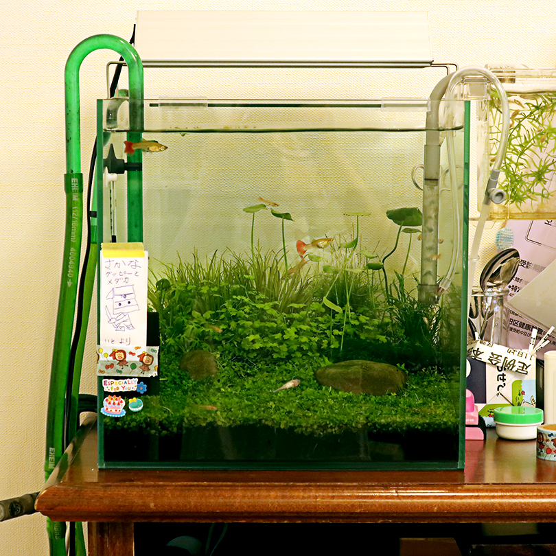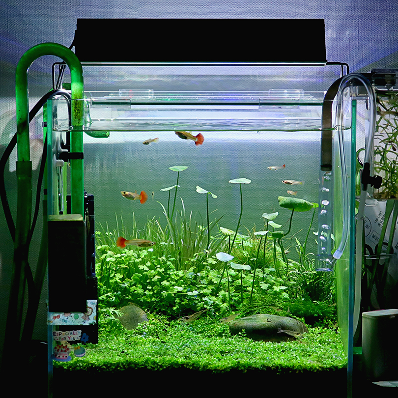 サテライト水槽のグッピーの稚魚(雌のみ)を少しずつ本水槽に移行。
