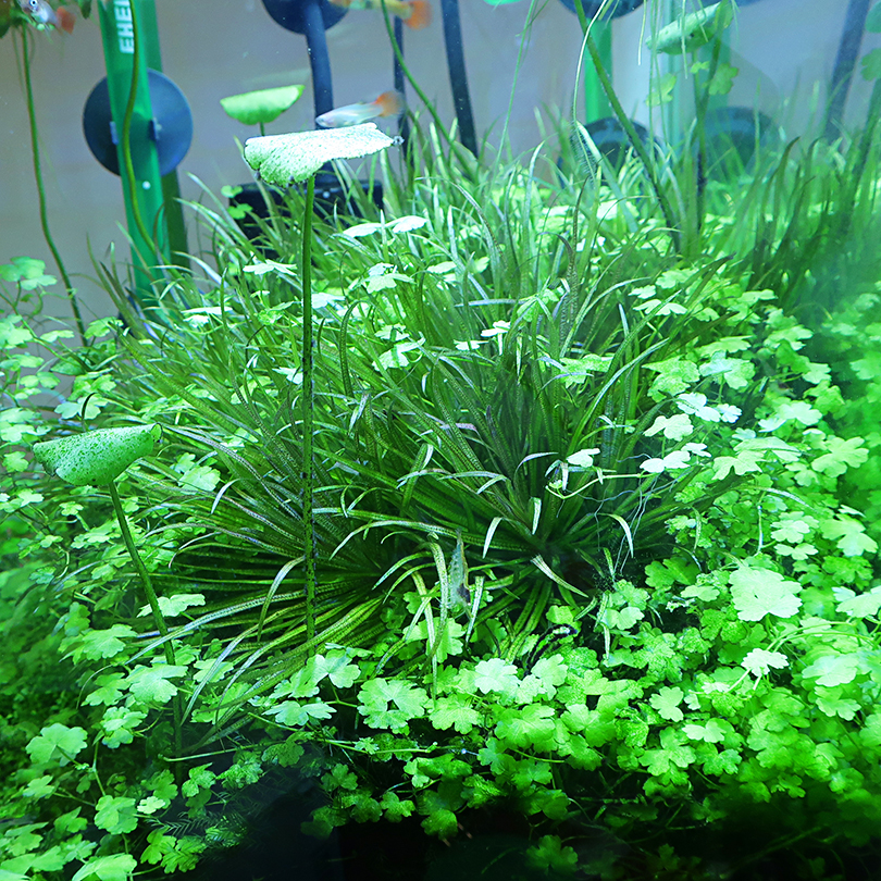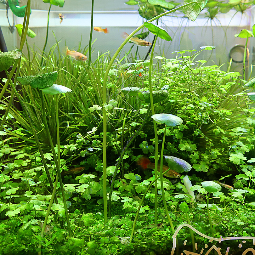 ヘアーグラス ショート、コブラグラス、南米ウィローモス、ウォーターフェザーが植わっている筈なのだが、ブリクサ ショートリーフとオーストラリアン ノチドメに制圧されてしまい、見る影もない。