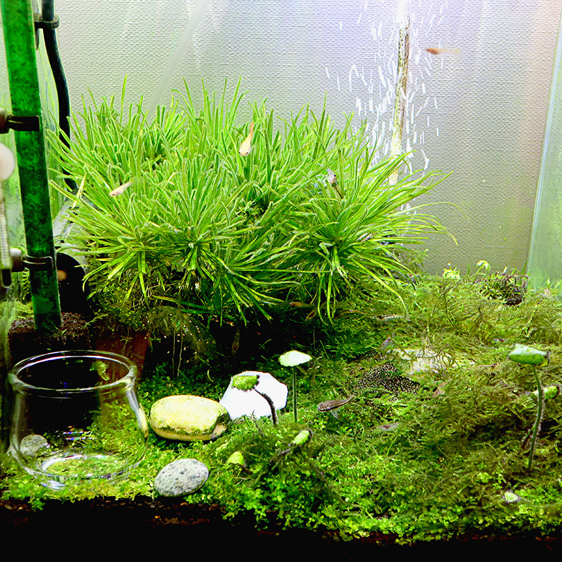 水草の繁茂具合は全体としては申し分ないのだけど、ニューラージパールグラスの根張りが弱いとか、南米ウィローモスの増殖が激しいとか、ミニマッシュルームの成長が止まったとか、色々と悩みは多い。