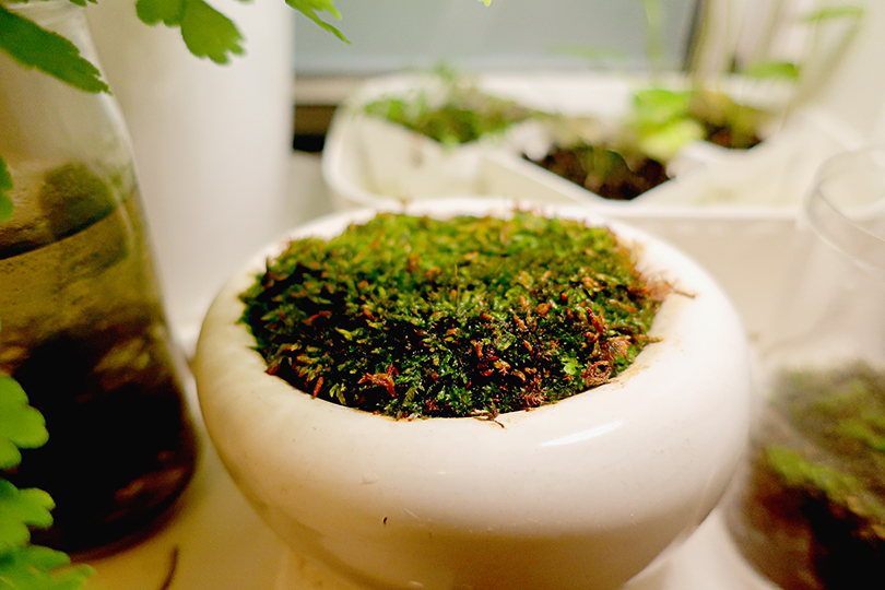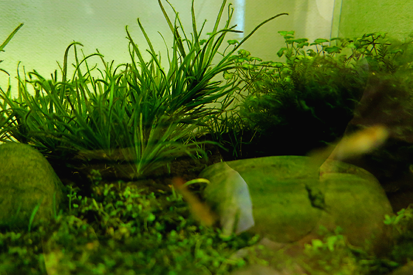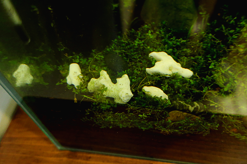 前景草のニューラージパールグラスの根張りが弱く、浮き上がってしまうため珊瑚で重石。