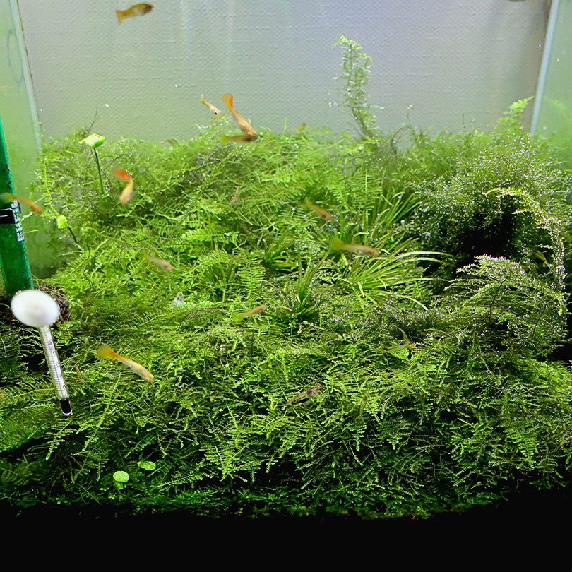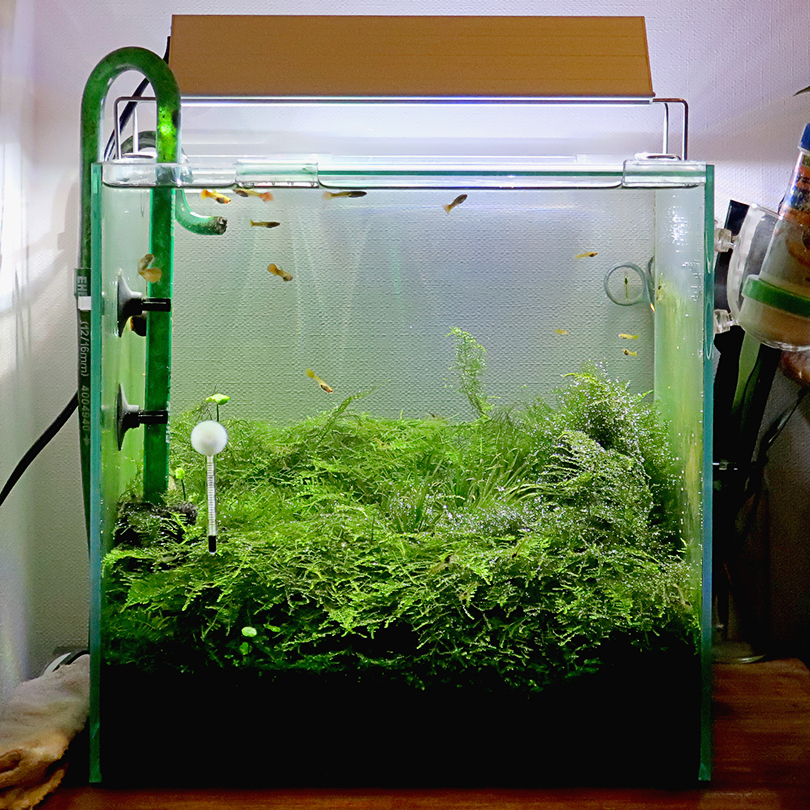水景は、南米ウィローモスとウォーターフェザーにほぼ制圧されてしまい、グッピーは累代飼育のせいで小型化。
