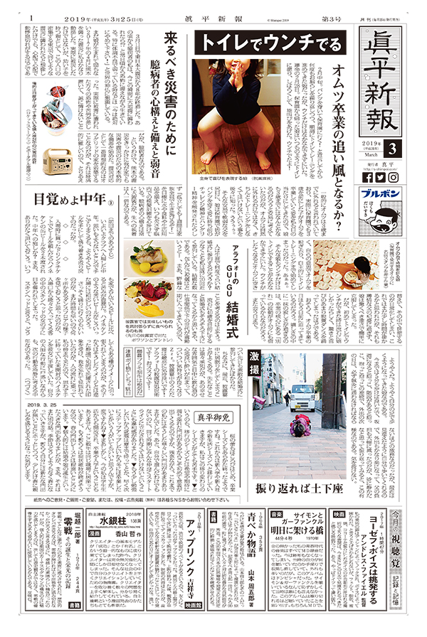 トイレでウンチでる オムツ卒業の追い風となるか? / 来るべき災害のために 臆病者の心構えと備えと弱音 / アラフォーのGU - GU 結婚式 / 激撮 振り返れば土下座 / 目覚めよ中年 ③ / 真平御免 / 今月の視聴覚 記録と記憶