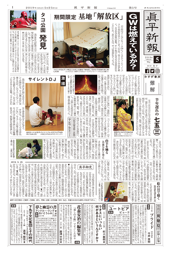 期間限定 基地「解放区」 GWは燃えているか? / タコ公園 発見 / 激撮 サイレントDJ / 半年遅れの 七五㊂ / 山羊を触る及び腰だが優しく撫でた / 絵の具で描く 絵の具を混ぜる楽しみ / 真平御免 / 今月の視聴覚 記録と記憶