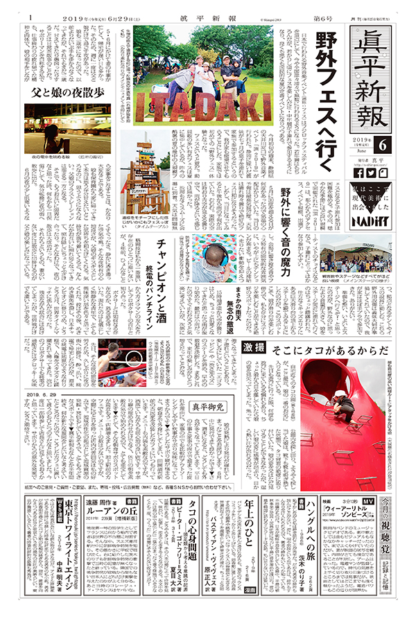 野外フェスへ行く 野外に響く音の魔力 / 父と娘の夜散歩 / チャンピオンと酒 終電のパンチライン / 激撮 そこにタコがあるからだ / 真平御免 / 今月の視聴覚 記録と記憶