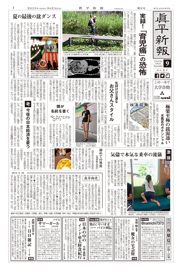 実録! 「育児痛」の恐怖 / 夏の最後の盆ダンス / 気付けば立派な お父さんスタイル / 極楽至極の銭湯通い 水風呂のポテンシャル / 娘が名前を書く / 考 今後の日本経済を憂う / 激撮 気儘で本気な乗車の流儀 / 初めての外食 生理現象との闘い / 真平御免 / 今月の視聴覚 記録と記憶