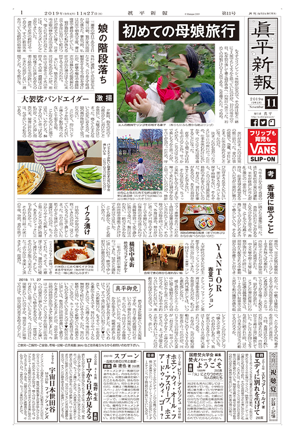 初めての母娘旅行 / 娘の階段落ち / 激撮 大袈裟バンドエイダー / 考 香港に思うこと / イクラ漬け / YANTOR 春夏コレクション / 横浜中華街 絶品のココナッツタルト / 真平御免 / 今月の視聴覚 記録と記憶