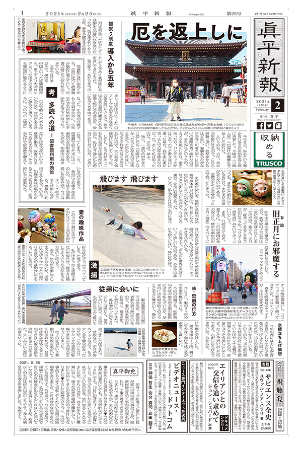厄を返上しに / 雛祭り制度 導入から五年 / 考 多読への道 ― 図書館利用の効能 / 激撮 飛びます 飛びます / 旧正月(春節)にお邪魔する / 妻の趣味作品 / 水槽立ち上げ構想 / 続・虫歯の行方 / 従弟に会いに / 今月の視聴覚 記録と記憶 / 真平御免