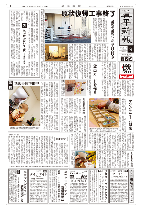 原状復帰工事終了 最後の最後に おまけ付き / 考 気が付かない夫たち ― 身近な絶望 / 貸出カードを作る / 激撮 活動再開準備中 / マンカラブーム到来 / 貴重な夫婦時間 / シン・エヴァ公開 / 真平御免 / 今月の視聴覚 記録と記憶