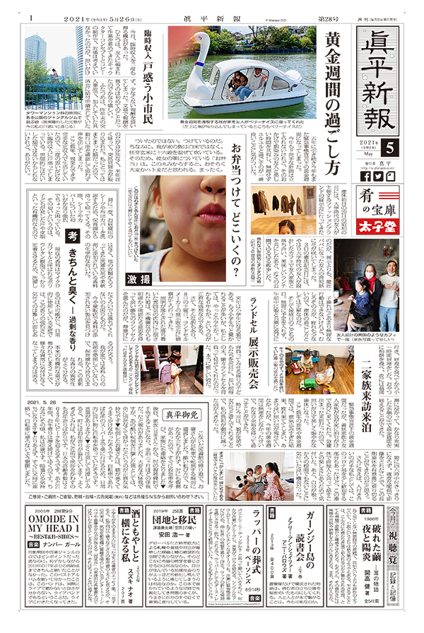 黄金週間の過ごし方 / 臨時収入 戸惑う小市民 / 激撮 お弁当つけて どこいくの? / 考 きちんと臭く ― 過剰な香り / ランドセル 展示販売会 / 二家族来訪来泊 / 真平御免 / 今月の視聴覚 記録と記憶