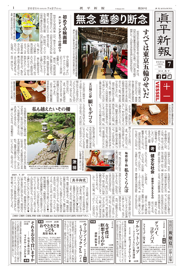 無念 墓参り断念 すべては東京五輪のせいだ / 初めての映画館 エンディングまでの道のり / 天の川への夢 願いをデコる / 激撮 私も越えたいその柵 / 考 健全な社会 ― 腰痛から見えるもの / 梅雨の贈り物 私さくらんぼ / 真平御免 / 今月の視聴覚 記録と記憶