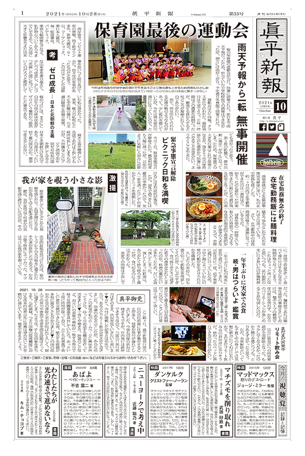保育園最後の運動会 雨天予報から一転 無事開催 / 考 ゼロ成長 ― 日本と北朝鮮の主義 / 緊急事態宣言解除 ピクニック日和を満喫 / 在宅勤務無念の終了 在宅勤務飯には麺料理 / 激撮 我が家を覗う小さな影 / 一年半ぶりに実家で会食 続・男はつらいよ 鑑賞 / まだまだ営業中 リモート飲み会 / 今月の視聴覚 記録と記憶 / 真平御免