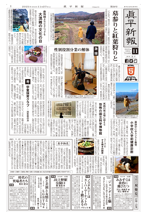 墓参りと紅葉狩りと / 動物園よりピクニックを 大混雑の文化の日 / 激撮 性別役割分業の解体 / 考 学童保育クラブ ― 35年前の方 / 死骸の展示場に震える 恐怖の国立科学博物館 / 遊泳中に小クジラと衝突 小学校入学前健康診断 / 今シーズン初 すき焼きの限界 / 今月の視聴覚 記録と記憶 / 真平御免