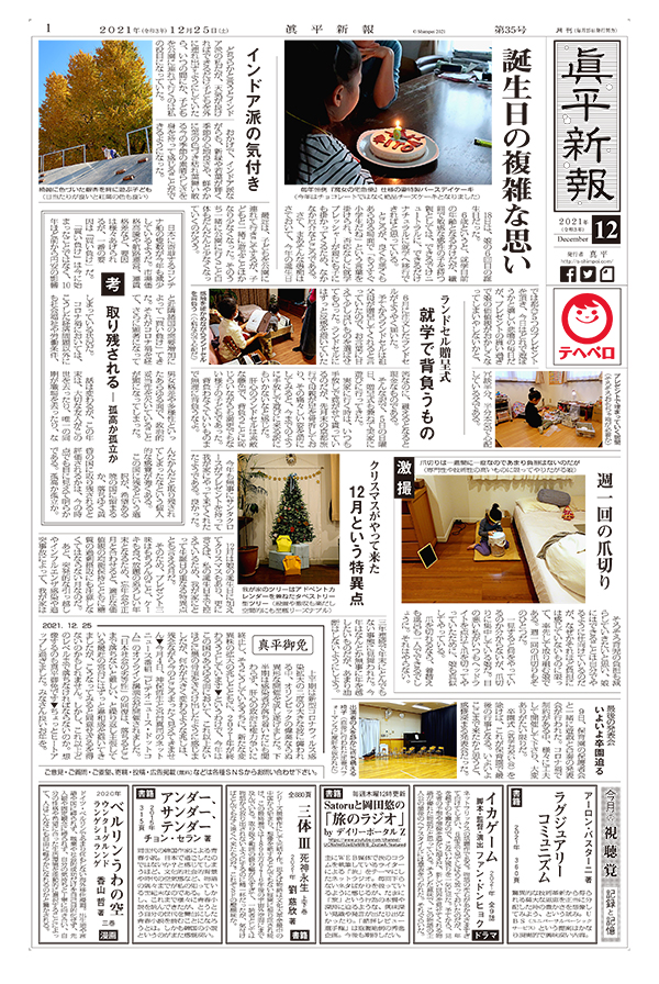 誕生日の複雑な思い / インドア派の気付き / 考 取り残される ― 孤高か孤立か / ランドセル贈呈式 就学で背負うもの / 激撮 週一回の爪切り / クリスマスがやって来た 12月という特異点 / 最後の発表会 いよいよ卒園迫る / 今月の視聴覚 記録と記憶 / 真平御免