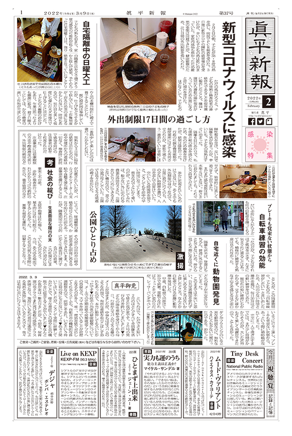 新型コロナウィルスに感染 外出制限17日間の過ごし方 / 自宅隔離中の日曜大工 / 考 社会の綻び ― 生真面目な履行の末 / 激撮 公園ひとり占め / ブレーキも覚束ない状態から 自転車練習の効能 / 自宅近くに 動物園発見 / 真平御免 / 今月の視聴覚 記録と記憶
