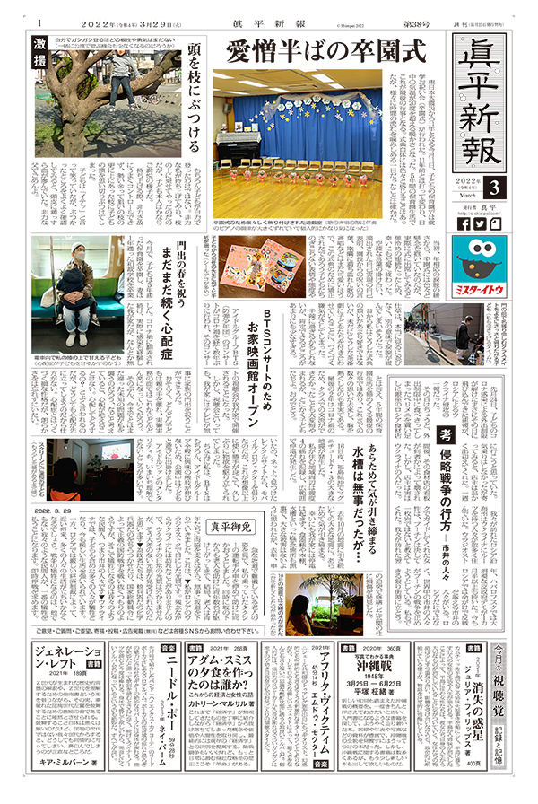 愛憎半ばの卒園式 / 激撮 頭を枝にぶつける / 門出の春を祝う まだまだ続く心配症 / BTSコンサートのため お家映画館オープン / 考 侵略戦争の行方 ― 市井の人々 / あらためて気が引き締まる 水槽は無事だったが… / 真平御免 / 今月の視聴覚 記録と記憶