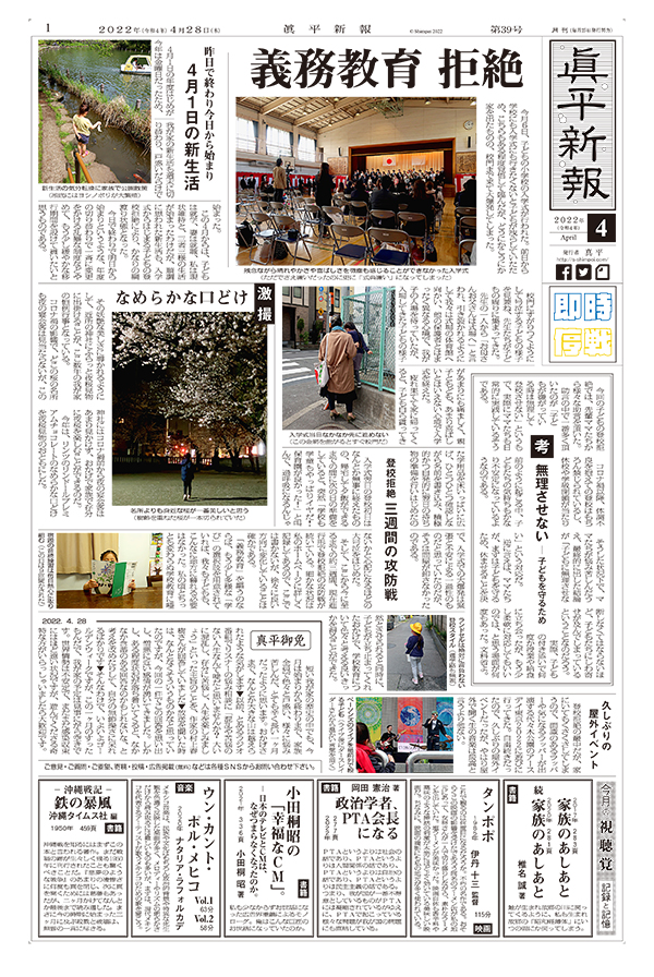義務教育 拒絶 / 登校拒絶 三週間の攻防戦 / 昨日で終わり今日から始まり 4月1日の新生活 / 激撮 なめらかな口どけ / 考 無理させない ― 子どもを守るため / 久しぶりの屋外イベント / 真平御免 / 今月の視聴覚 記録と記憶