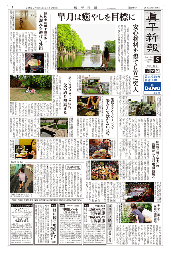 皐月は癒やしを目標に 安心材料を得てGWに突入 / 連休中は雨予報が多し 人混みを避けて外出 / 思い切ってピクニック決行 父の釣り熱高まる / 生活をアウトソーシング 米なんて炊かないGW / 隆の勝と照ノ富士に熱 銭湯から五月場所観戦へ / 真平御免 / 巣立ちに備えて伝統の和綿栽培 / 今月の視聴覚 記録と記憶