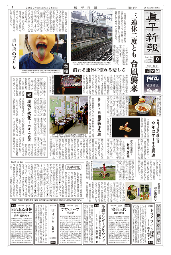 三連休二度とも 台風襲来 潰れる連休に慣れる悲しさ / 激撮 青い舌の子ども / 考 凋落と劣化 ― カルトで救済 / 誰のため? 自由課題作品展 / 9月は妻の誕生日 今年はケーキを調達 / 次の自転車は? 新調の時期 / 夏の最後の お弁当作り / 真平御免 / 今月の視聴覚 記録と記憶