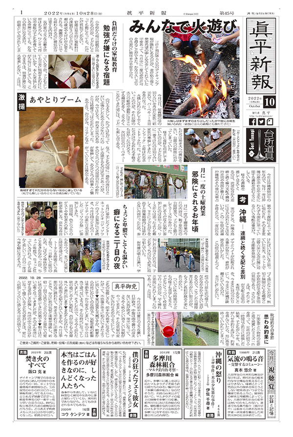 みんなで火遊び / 負担だらけの家庭教育 勉強が嫌になる宿題 / 激撮 あやとりブーム / 考 沖縄 ― 連綿と続く支配と差別 / 月に一度の土曜授業 邪険にされるお年頃 / ちょっと卑猥で とても温かい 癖になる二丁目の夜 / 秋は釣りの季節 思わぬ釣果に / 真平御免 / 今月の視聴覚 記録と記憶