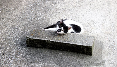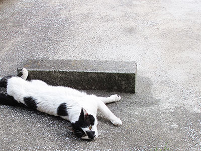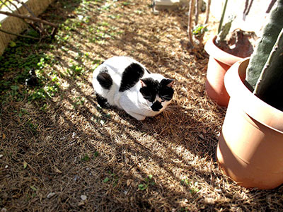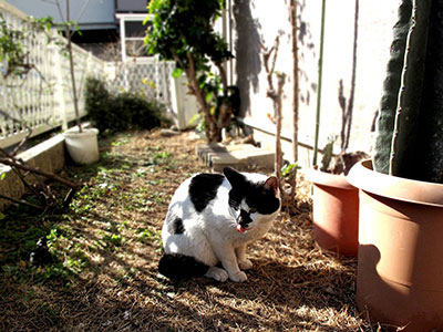 買い物に出かけ、昼食をとって帰ってくると、野良猫はまだ庭にいて、日向でのんびり丸くなっていた。